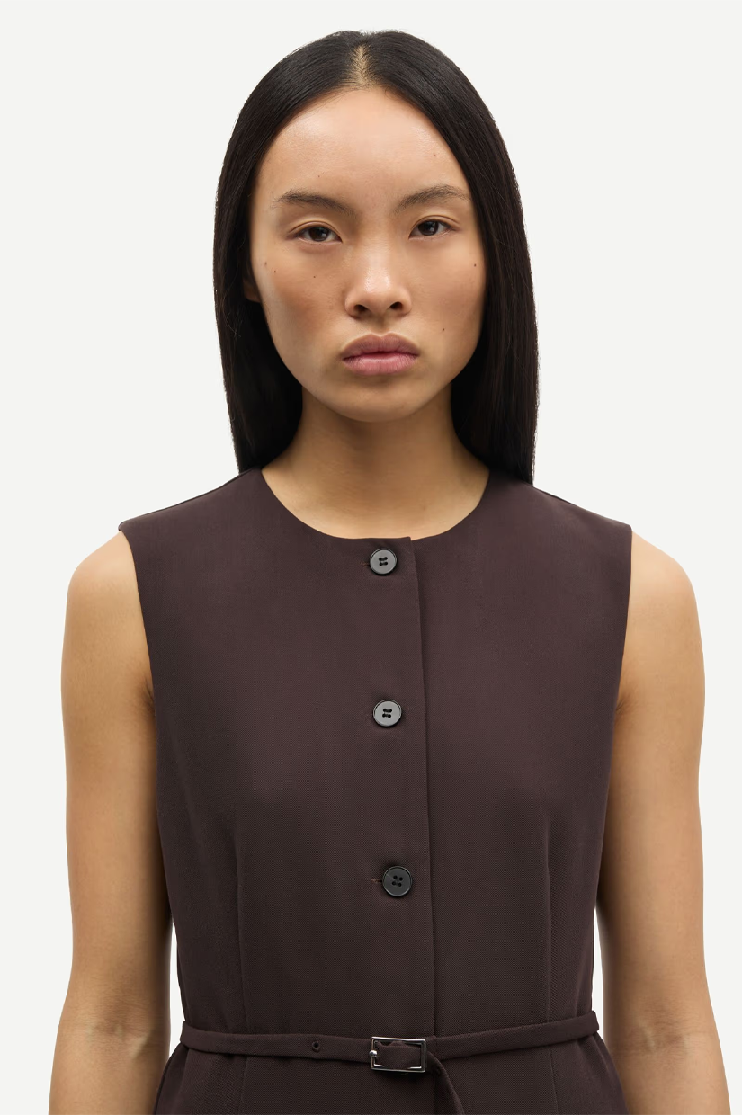 Sleeveless minidress with a regular fit. Button closure on the front. O-neck. Belt loops and thin belt at the waist. Fully lined. Main material made from an elastic blend including recycled polyester.