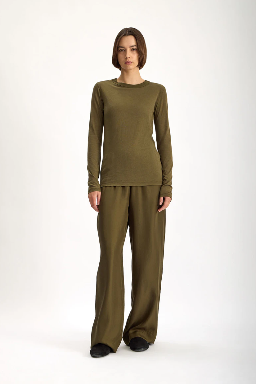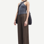 Finely pleated jersey trousers with a loose fit and wide leg. Elasticated waistband. Side slit pockets. Main material made from a recycled polyester-blend.