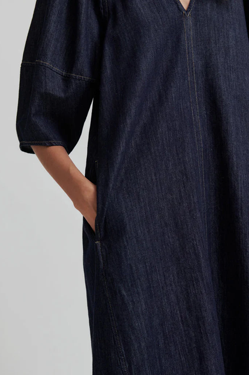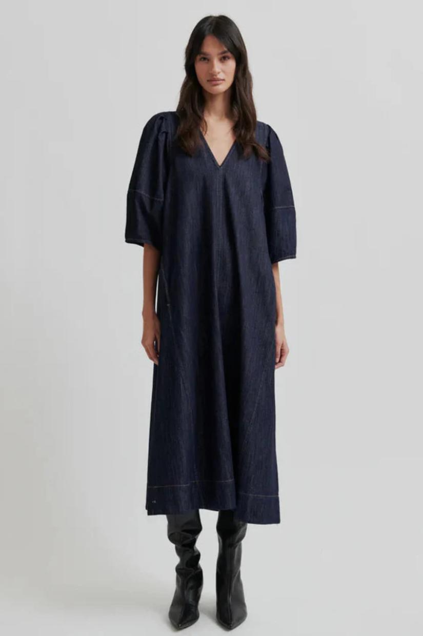Crafted from cotton denim in a dark blue wash with contrast stitching, this short-sleeved dress features a flattering V-neckline and softly puffed sleeves. Concealed side seam pockets add practicality, while the regular fit and A-line silhouette create an effortlessly feminine shape.