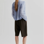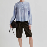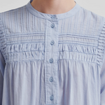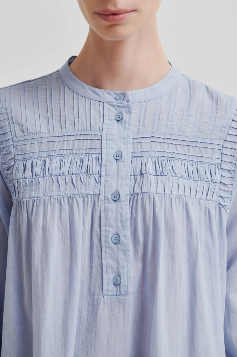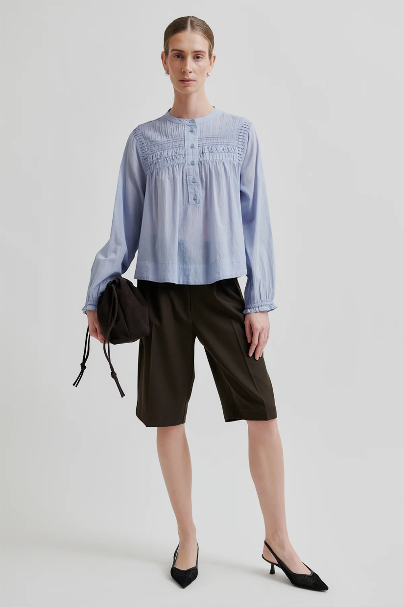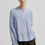Second Female long-sleeved blouse in smooth, lightweight cotton. Featuring a round neckline and half placket with button fastening. Stitching details at top and shoulders that create structure. Long sleeves with elasticated cuffs. Relaxed and airy fit.