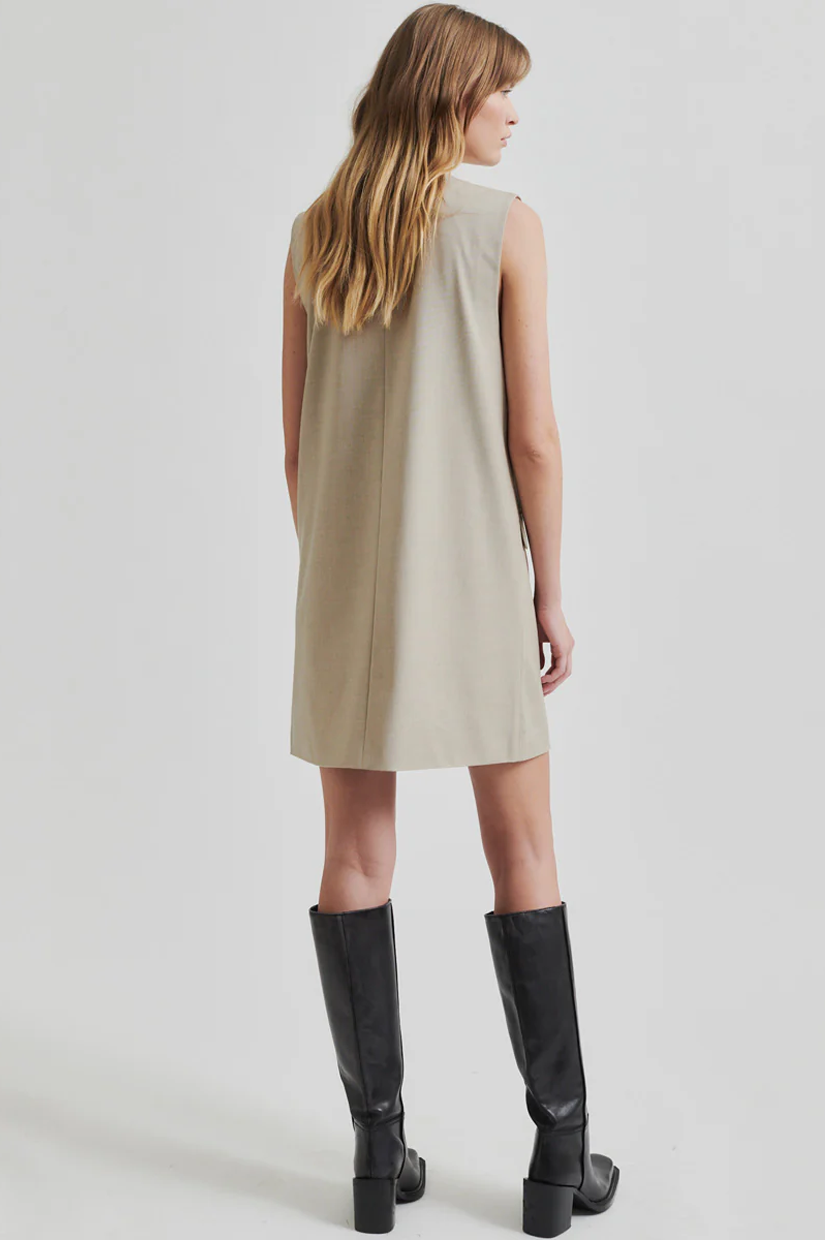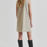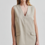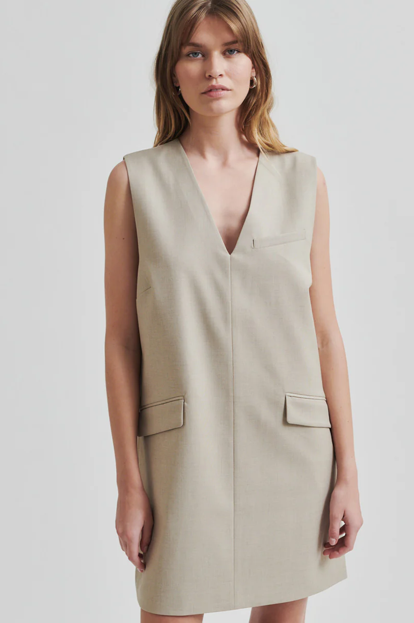 This Second Female dress exudes minimalist elegance with its timeless silhouette. The fabric drapes beautifully and gives the dress a structured yet relaxed look. A deep v-neck and flap pockets complete the look. This versatile dress works as a standalone or paired with a dress shirt – perfect for the office!