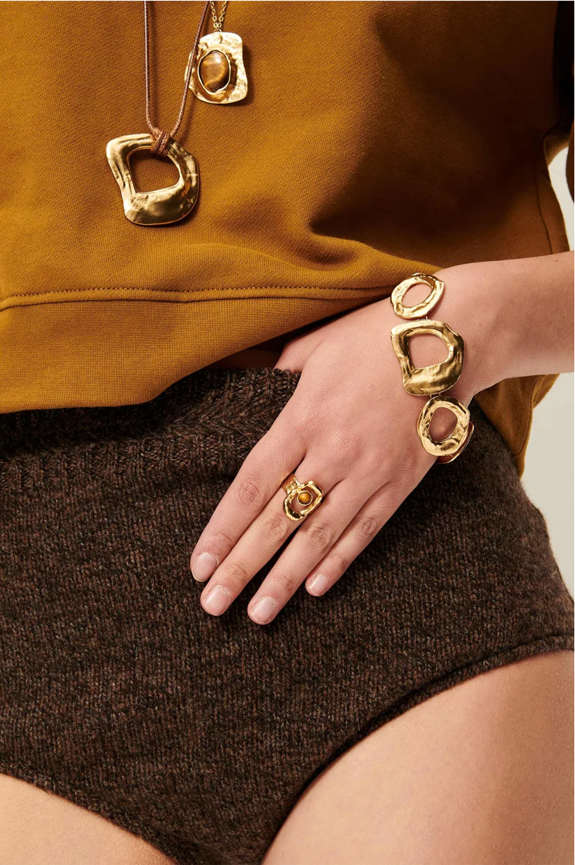 Gold-finish bracelet featuring irregular rings with a textured surface.