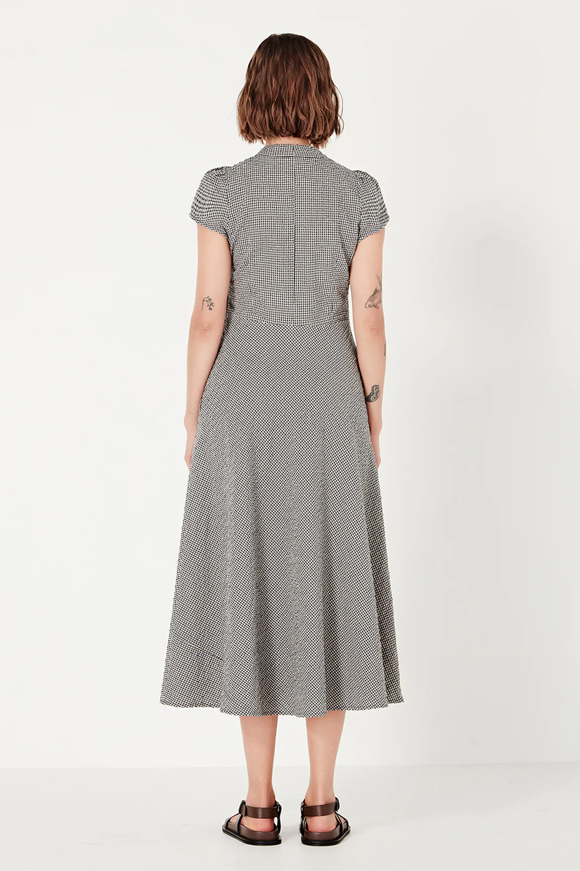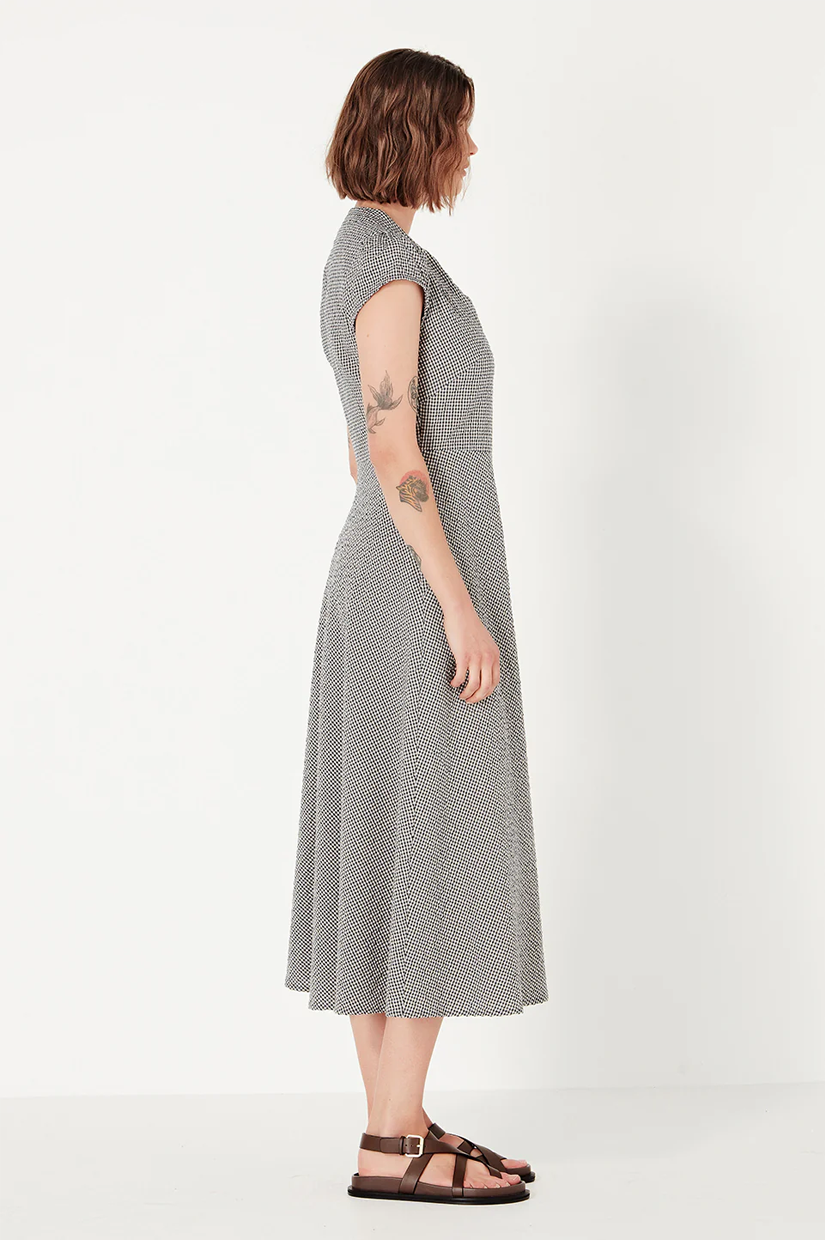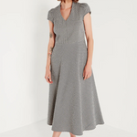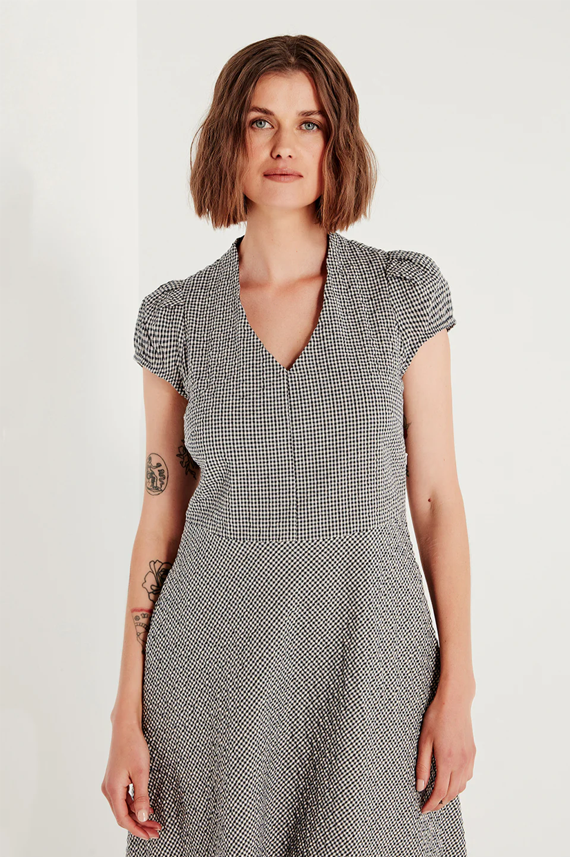 The Crosby Dress is designed to flatter with quiet ease. A V-neckline, structured bodice, and nipped-in waist flow into a flattering bias-cut A-line skirt, creating an elegant silhouette that skims the figure. Cap sleeves provide just the right amount of coverage and balance for the warmer weather.