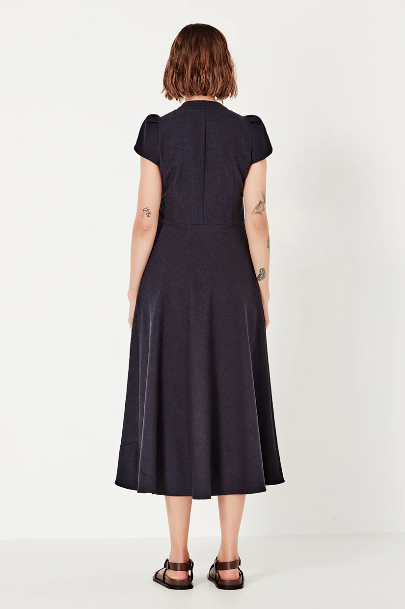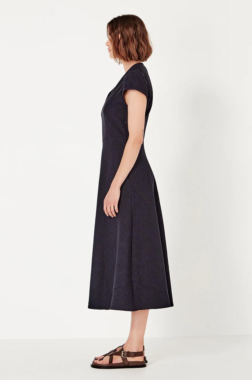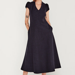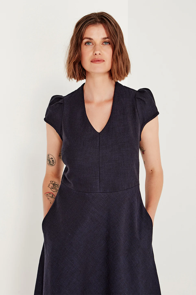 The Crosby Dress is designed to flatter with quiet ease. A V-neckline, structured bodice, and nipped-in waist flow into a flattering bias-cut A-line skirt, creating an elegant silhouette that skims the figure. Cap sleeves provide just the right amount of coverage and balance for the warmer weather.
