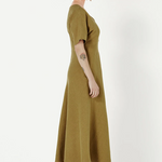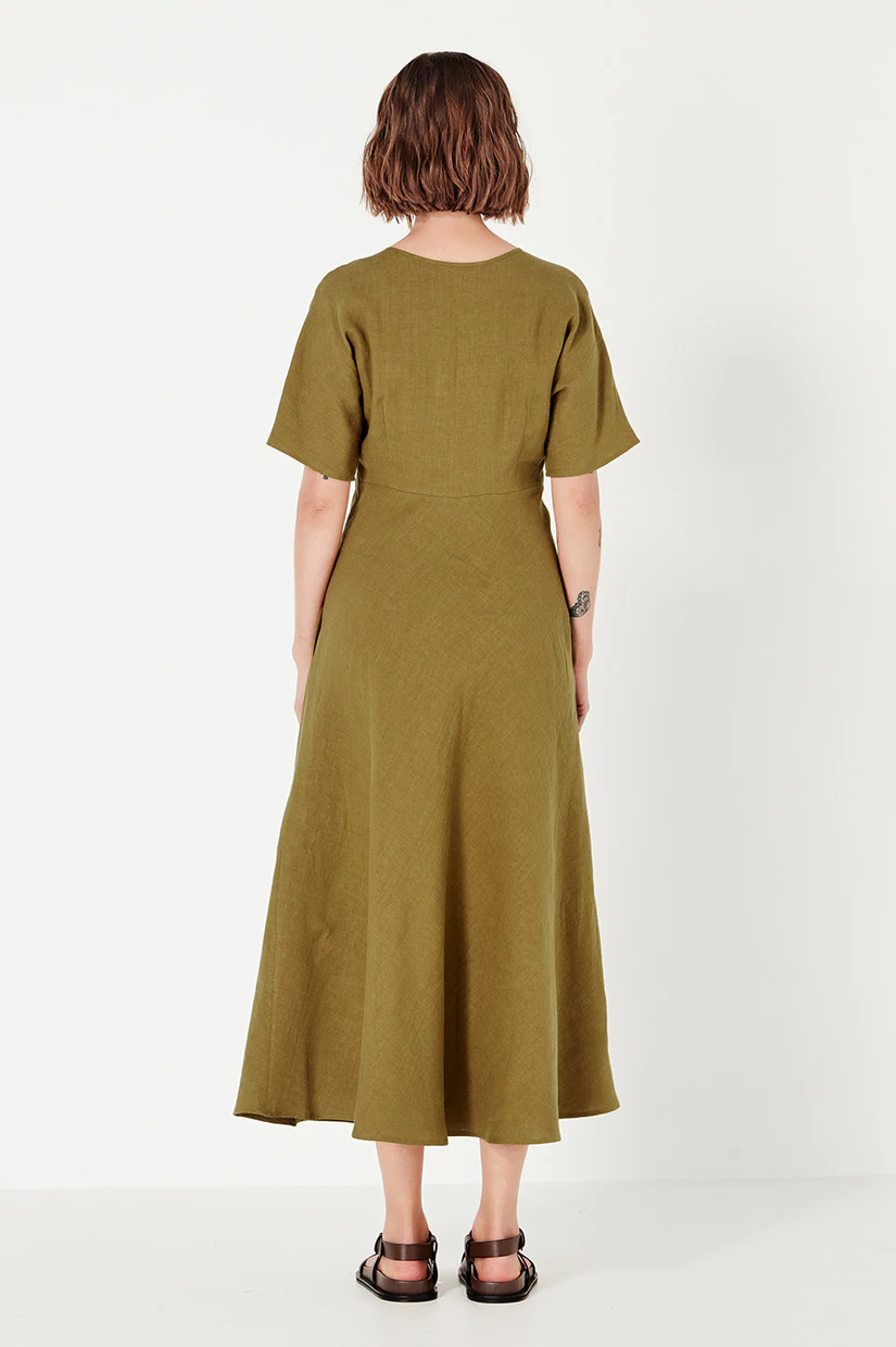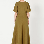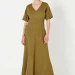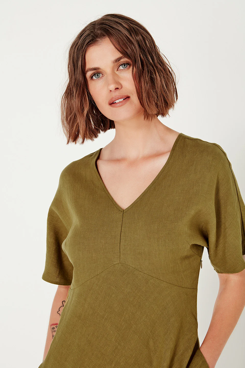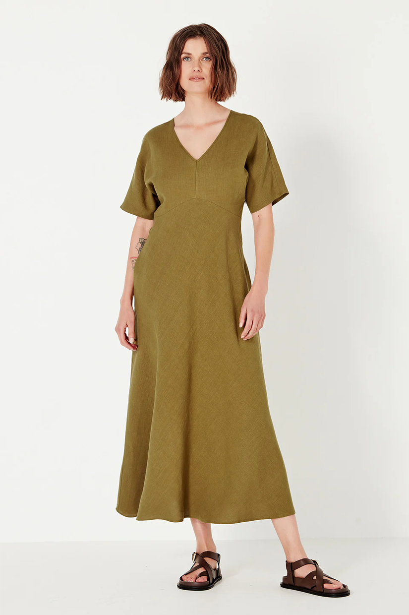 The Evie Dress is this season’s take-you-anywhere summer style. A bias-cut midi skirt falls neatly from a defined waist, creating a universally flattering A-line silhouette. A chic V-neckline and dolman sleeves add both ease and refinement, while a concealed side zip keeps the lines clean.