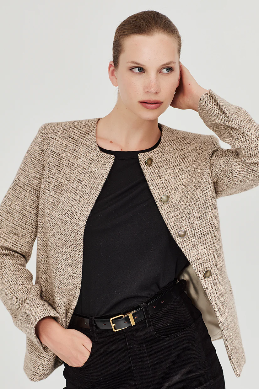 Finished with antique brass buttons and understated jet pockets, the Freud brings structure and polish without losing versatility. A piece designed to integrate, yet quietly transform.