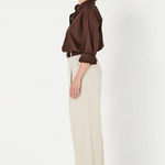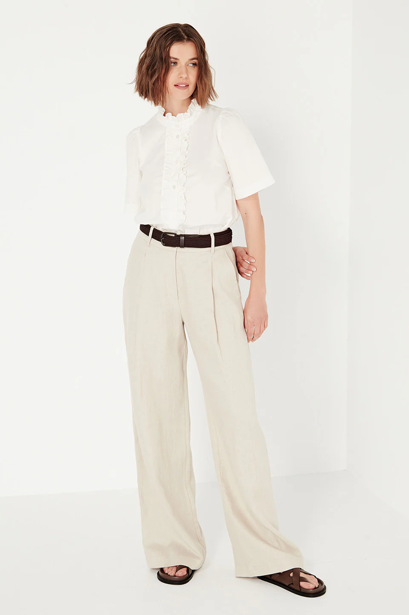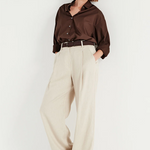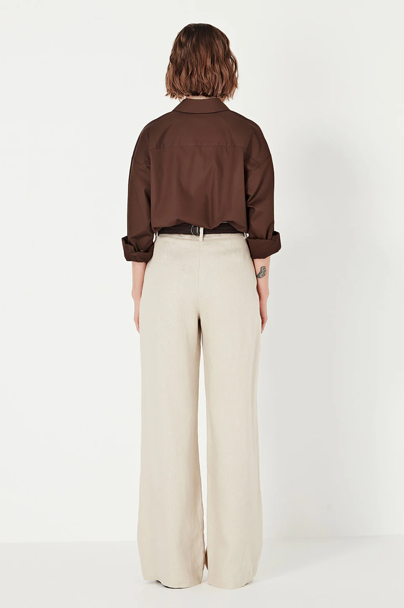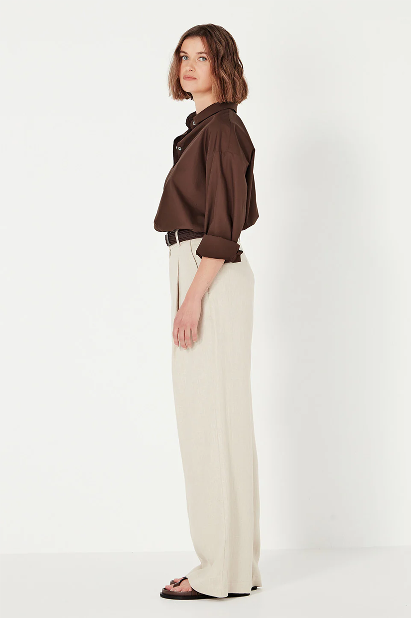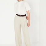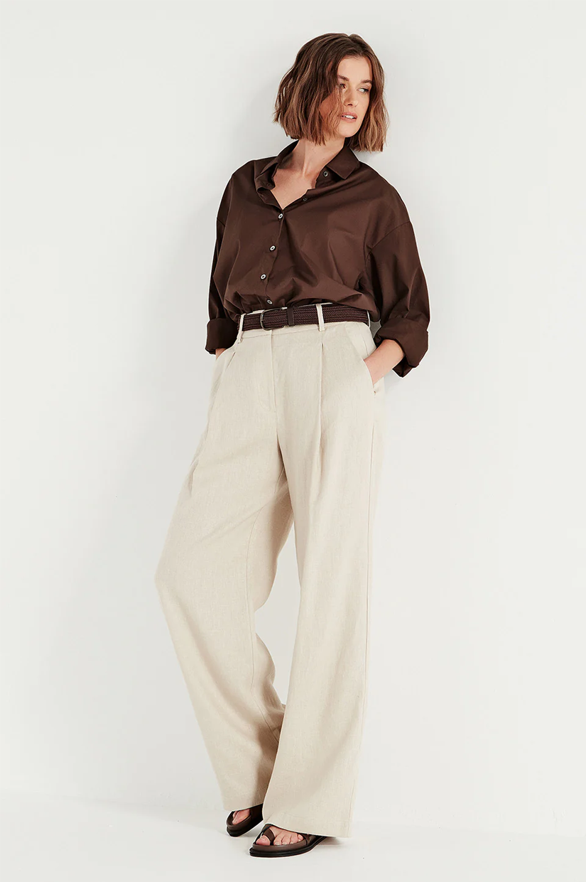 Drawing upon all the right ingredients that make Shjark pleat trousers such a coveted and figure-flattering favourite, the Selbourne Trouser is a pared-back favourite, perfect for the tropical months. The high rise and single outward-facing pleat create beautiful shape and definition through the waist, further enhanced through the flowing wide leg. Deep slip pockets add comfort and functionality, while the back is kept clean for a flattering fit. This Japanese Linen fabrication has a classic authenticity and a relaxed summer vibe.