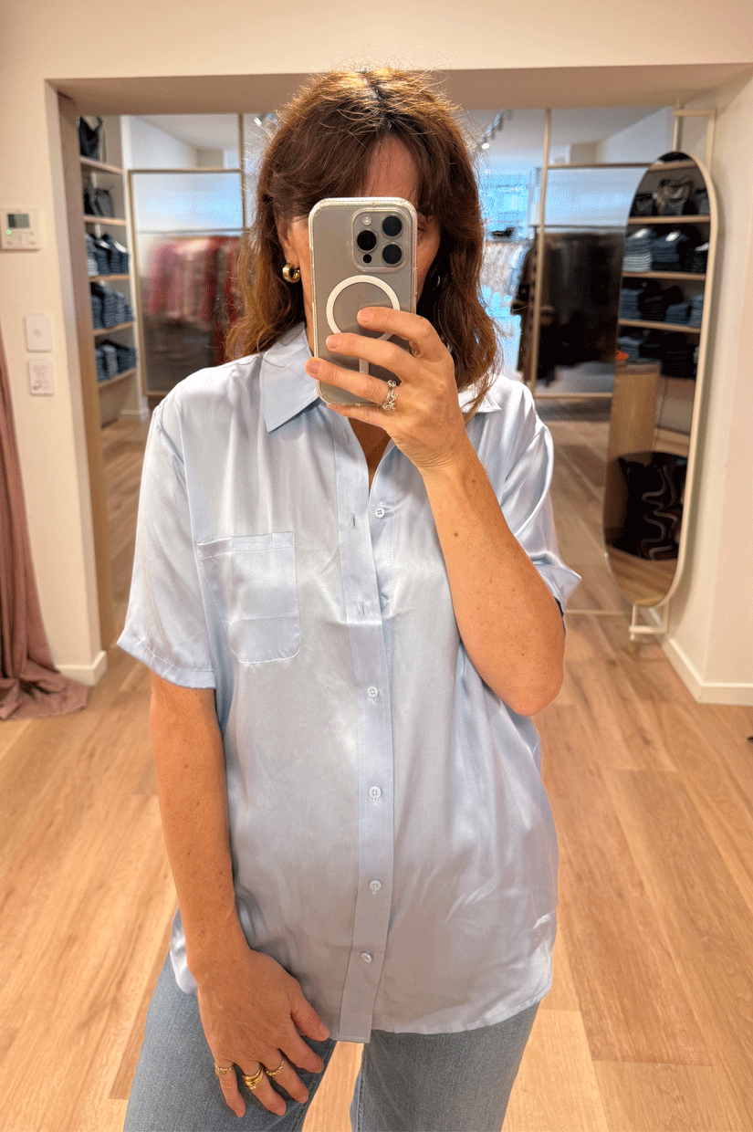 Our new Silk Laundry Short Sleeve Boyfriend Shirt Version 2.0 features a relaxed, oversized fit with breast pockets and a pen pocket. Made from 16mm sandwashed silk satin and finished with internal French seams. Crafted from 100% Silk.
