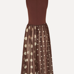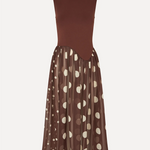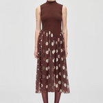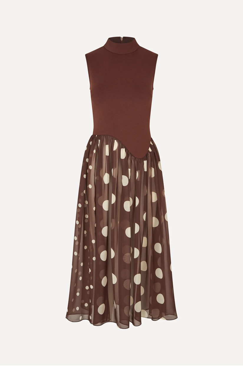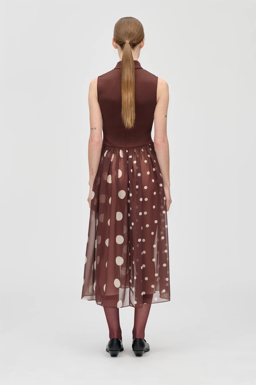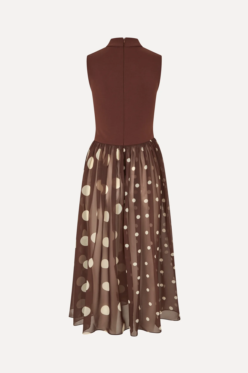 Sleeveless midi dress in chocolate brown with a high neck. Features a fitted jersey top and an A-line skirt in sheer organza with a playful off-white polka dot pattern. The waist is softly curved for a flattering silhouette. Finished with a hidden zip closure at the back.