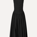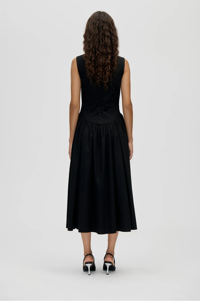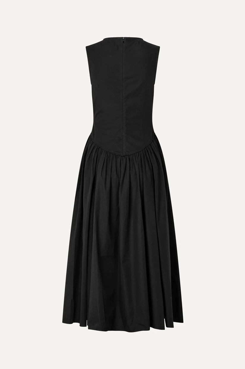 Black sleeveless midi dress crafted from organic cotton. Features intricate broderie anglaise embroidery on the bodice, a fitted waist, and a gathered skirt for added volume. Designed with side pockets and a concealed zip closure at the back.