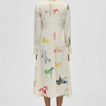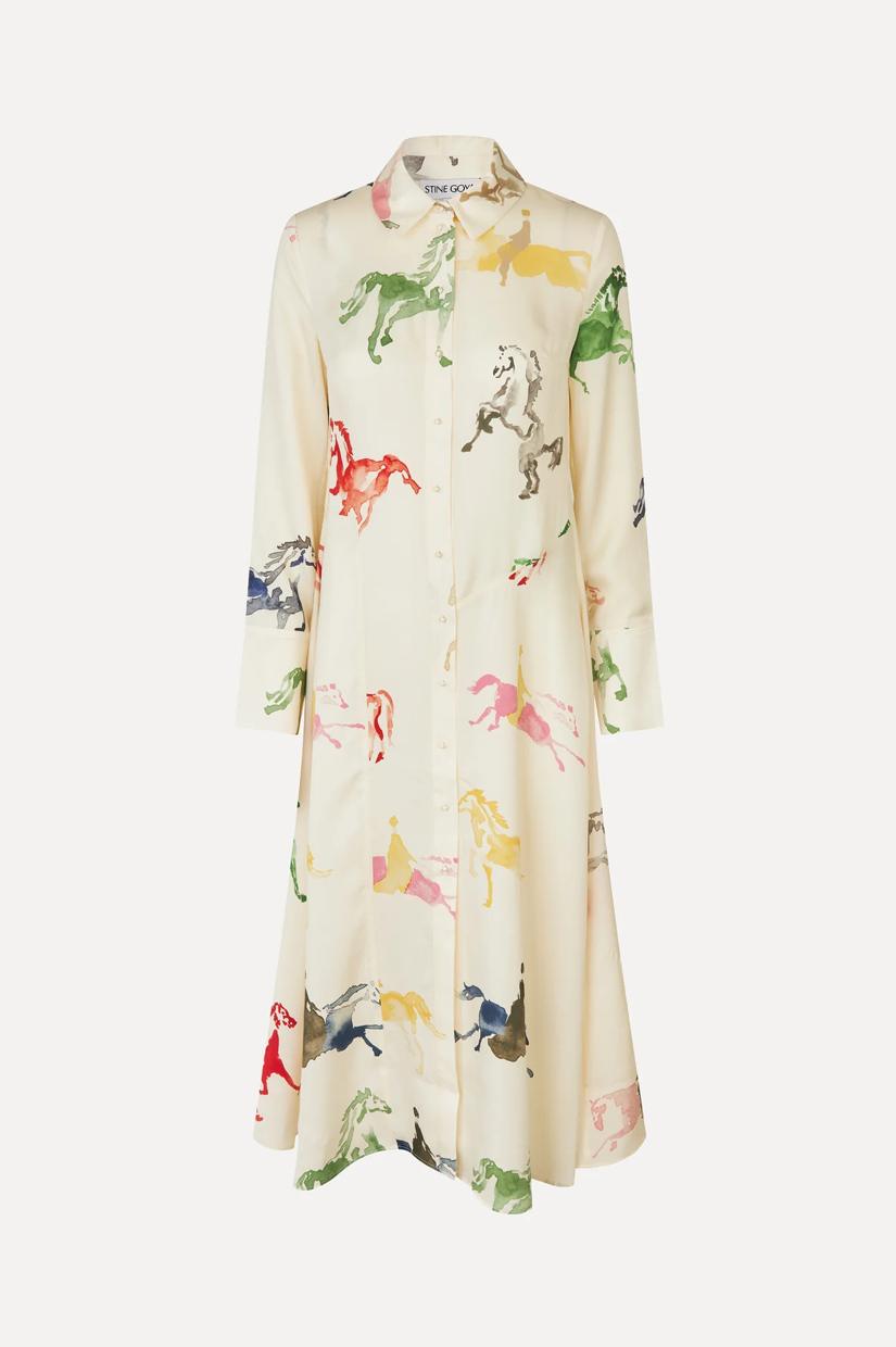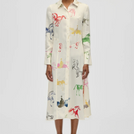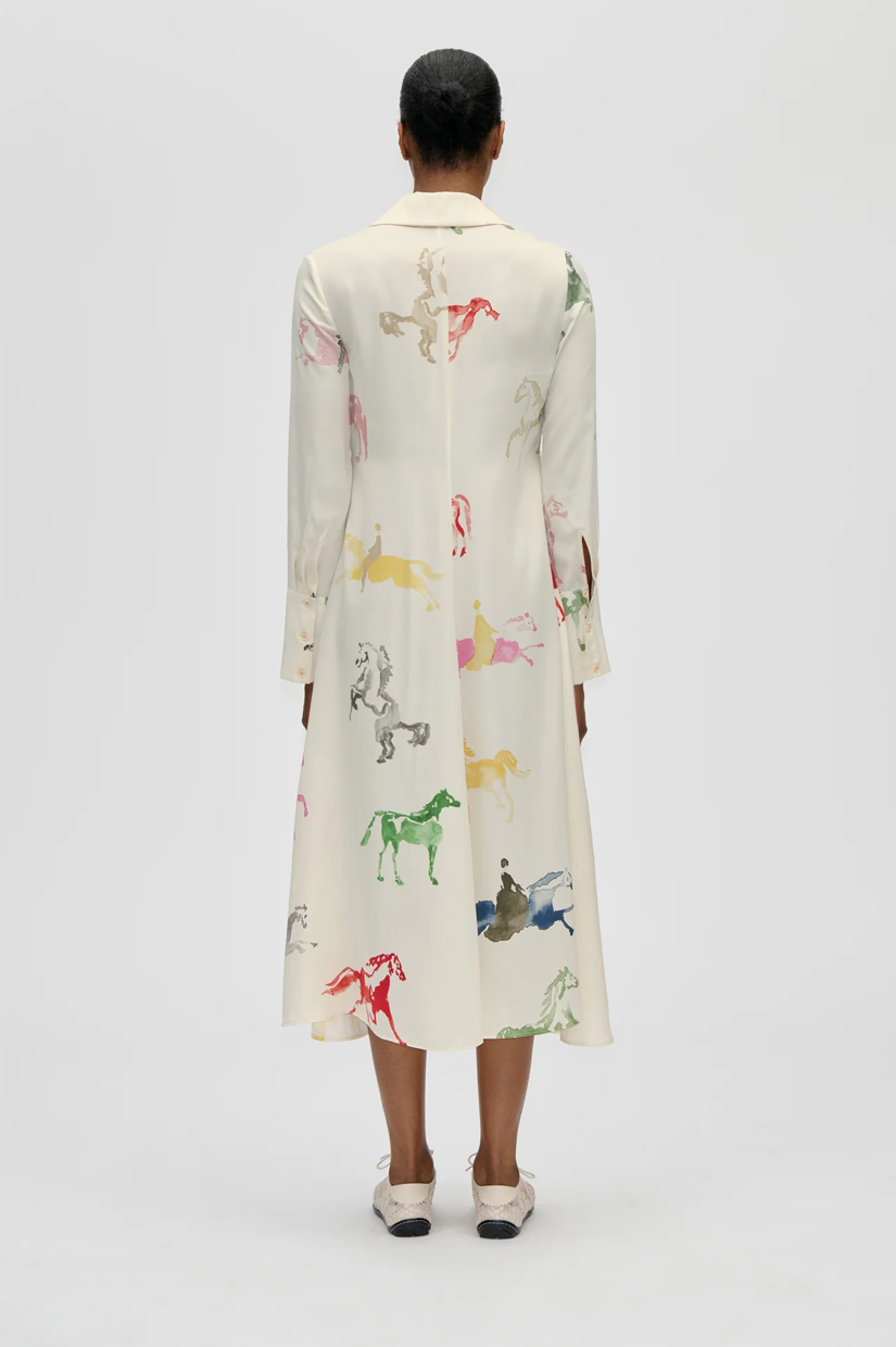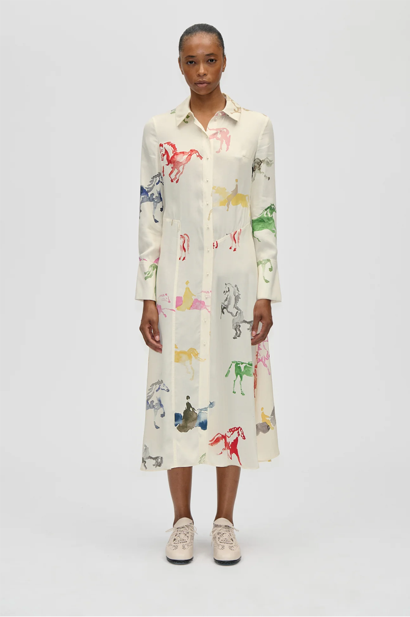 Off-white shirt dress adorned with a hand-painted multicolour horse artwork. Crafted from a lightweight TENCEL™ Lyocell blend. Designed with long cuffed sleeves, a classic collar, and a stud button closure along the front.