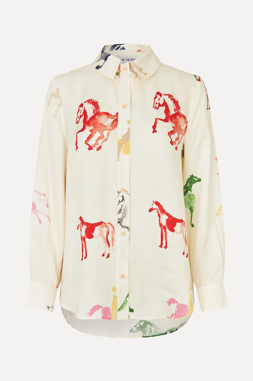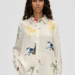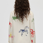 Off-white relaxed-fit shirt with a colourful hand-painted horse artwork. Featuring a pointed collar, button-down front, and long sleeves with buttoned cuffs. Made from a soft and lightweight TENCEL™ Lyocell and viscose blend. Style with the matching trousers for a coordinated statement look.