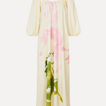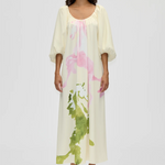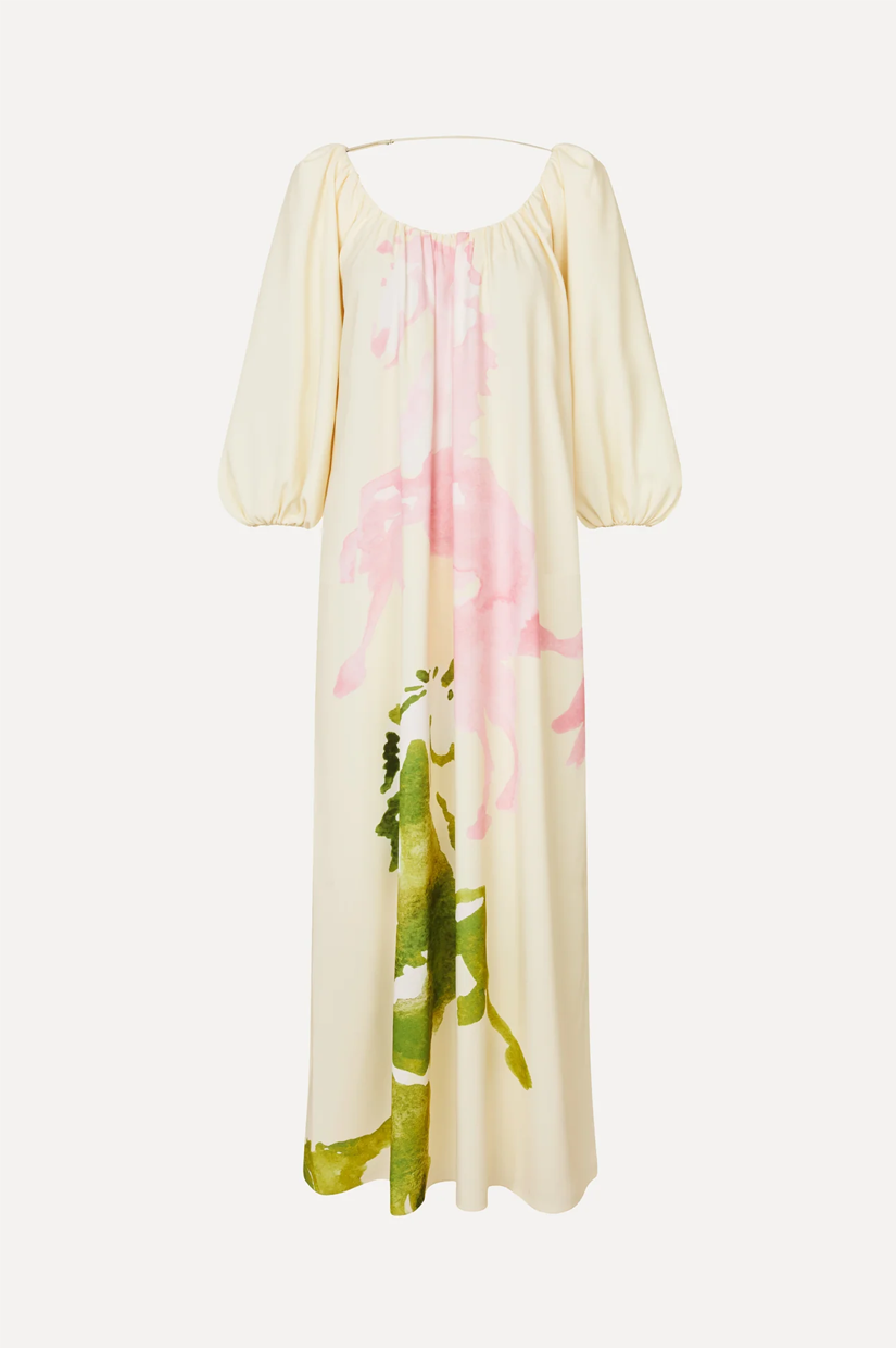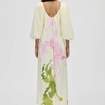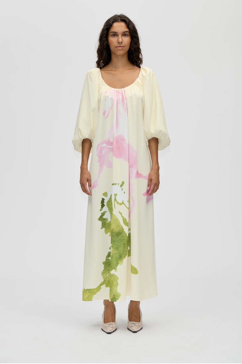 Cream-coloured maxi dress featuring a hand-painted light pink and green horse artwork. Designed with voluminous puff sleeves, open back with strap detail, and a relaxed silhouette. Fully lined.