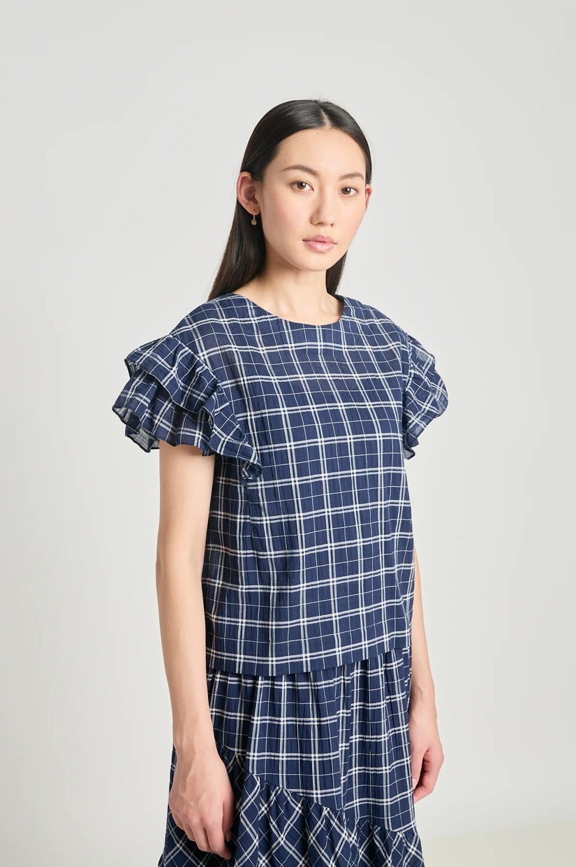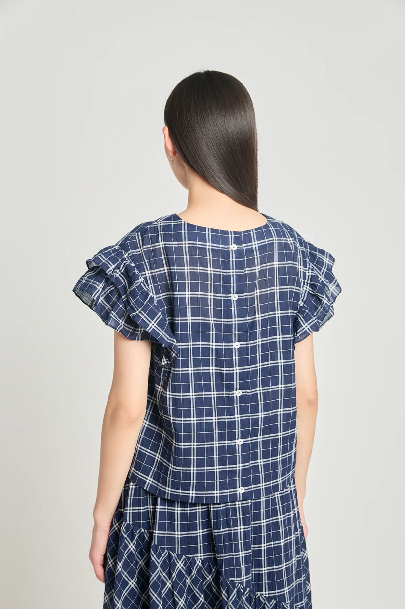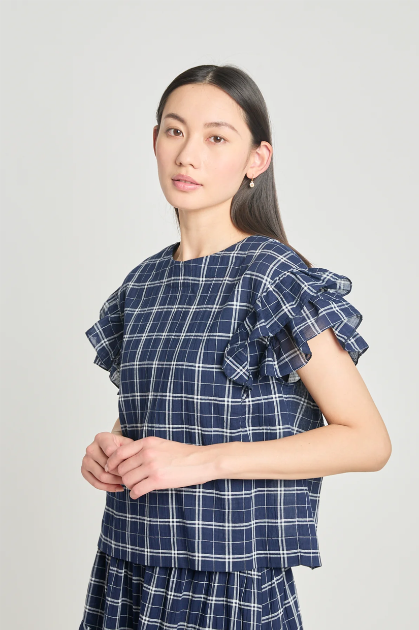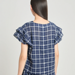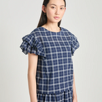 Let's sit with this one a little longer. The Analyse this top is sleeveless with shoulder frills and button-down back placket. Cut in a deadstock navy plaid cotton, and paired perfectly with the Art therapy skirt.