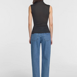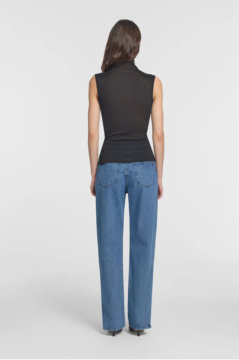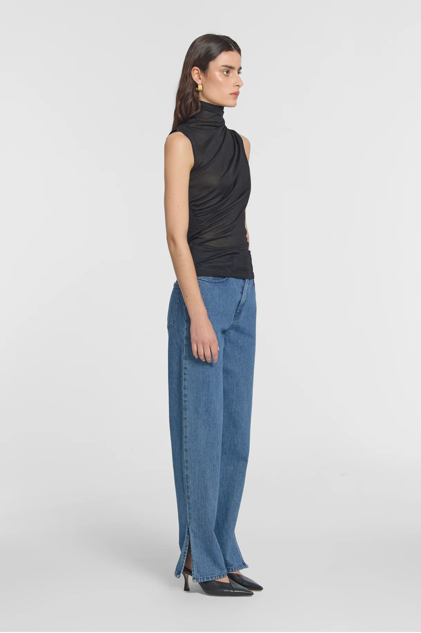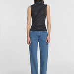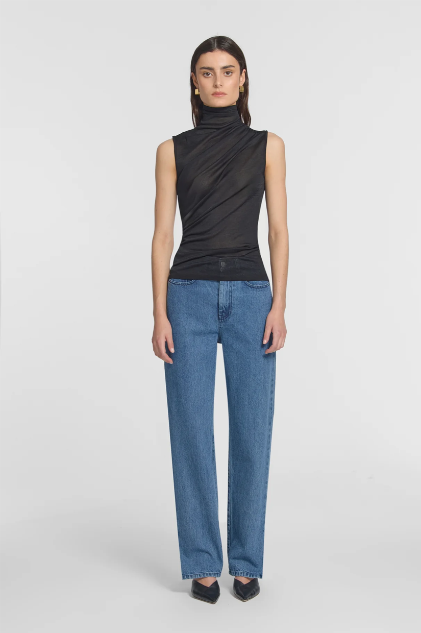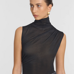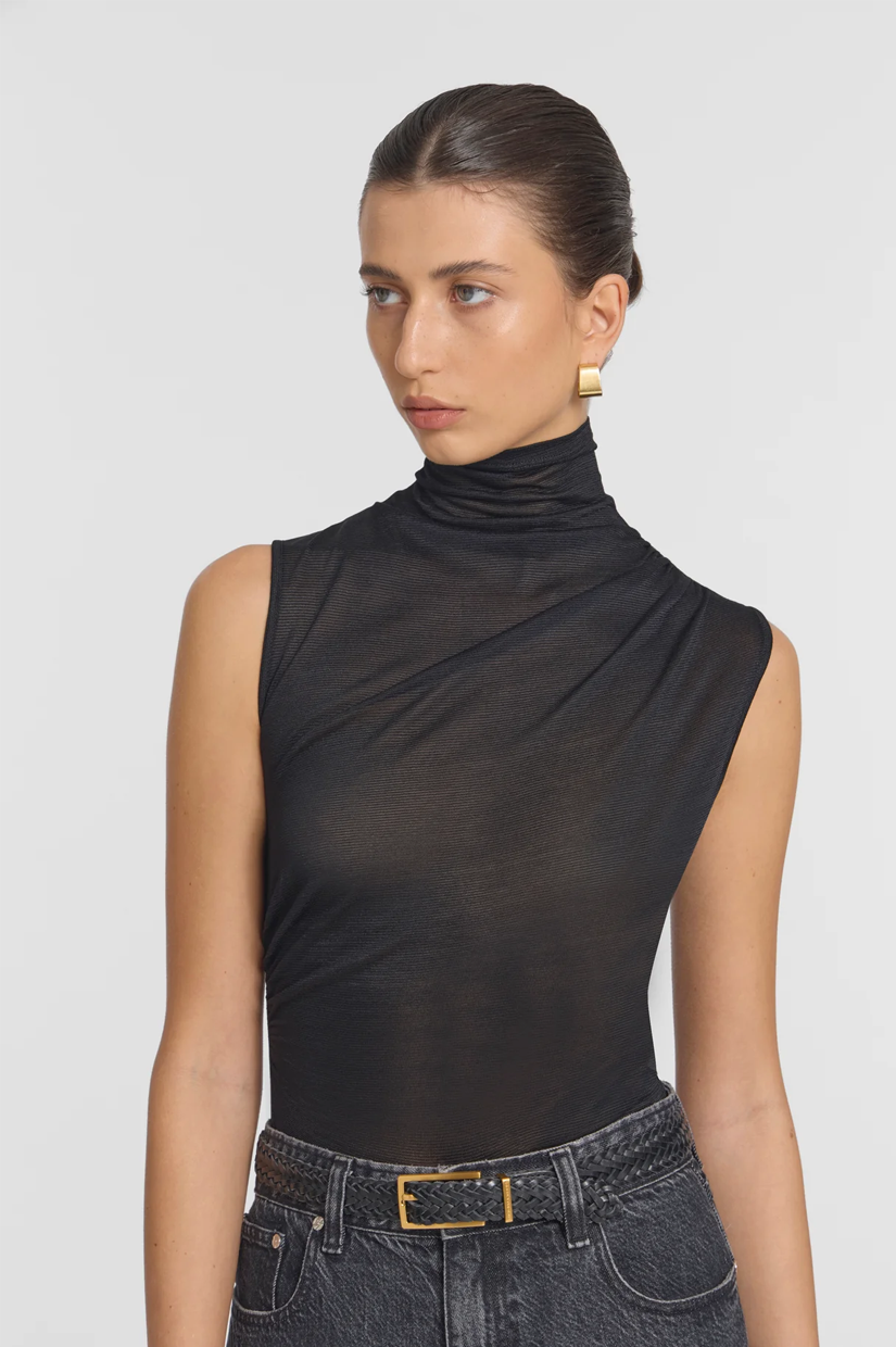 The Sunset Top, a sleeveless take on our best selling Moonlight Skivvy, is crafted in a fiery sunset red. Featuring an exaggerated turtleneck and subtle ruching, its slightly sheer fabric adds an ethereal touch. Wear layered or as a standalone statement, pairing it with the Whirlwind Pant for a set dressing moment, or style back with denim or black.