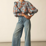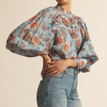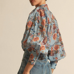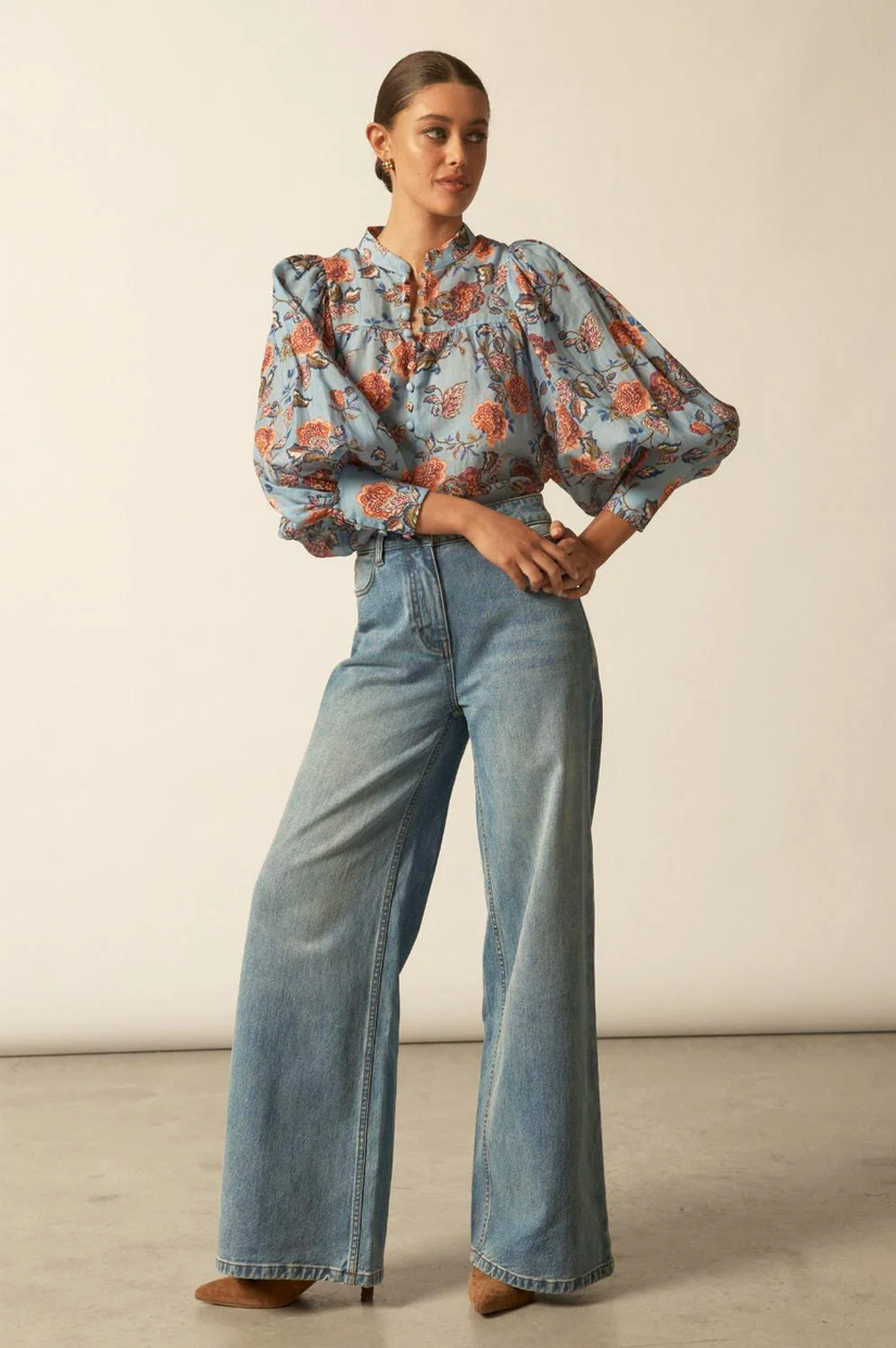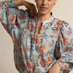 a refined transitional essential. the vista top balances softness and structure for effortless autumn–winter dressing. A cool blue base softened with warm florals, Twilight Bloom feels balanced, feminine, and easy to wear.